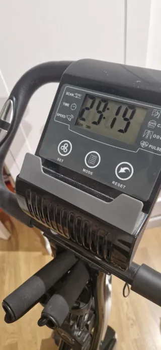 Bicicleta estática con pantalla digital. - Muestra tiempo, velocidad y escaneo. - Botones de SET, MODE y RESET.
