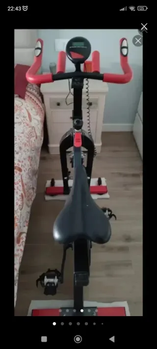 Bicicleta de ciclismo indoor pensada para quienes practican este deporte. Con su volante de inercial de 18Kg, conseguirás un entrenamiento completo. Peso total 36kg. - Volante de inercia de 18Kg. - Diseño inspirado en bicis de competición. - Ideal para entrenamientos de alta intensidad. - Monitor LCD para calorias , kilometros ,velocidad... -Ruedas para transporte fácil. -Nivel de resistencia ajustable. IMPORTANTE: Esta como nueva y como podéis ver la pastilla del freno muy poco usada. Problema , mi perra corto el cable de la pantalla LCD ademas de mordisquear los pedales . Se puede arreglar y cambiar . Por lo demás esta 👌🏻