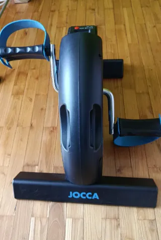 Mini bicicleta estática de la marca JOCCA, ideal para ejercitar piernas y brazos. - Diseño compacto y portátil. - Pedales con correas de sujeción. - Pantalla digital para seguimiento de ejercicio.