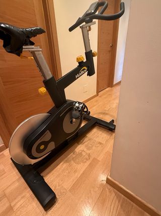 Bicicleta de spinning Halley Fitness, modelo Hirondelle. Diseñada para entrenamientos intensos. - Volante de inercia de aluminio: muy equilibrado, proporciona una sensación de pedaleo redondo. - Correa Poly V: proporciona una tracción optima y no requiere mantenimiento. - Posición del sillín y del manillar ajustable en altura según el objetivo del entrenamiento. - Sistema de fijación de los pedales y el sillín: permiten que el usuario pueda utilizar sus propios pedales de clip o un sillín de ciclismo. - Factor Q : La distancia entre las bielas es de 190 mm, similar a las bicicletas de carretera. HAY QUE CAMBIAR EL SILLIN.
