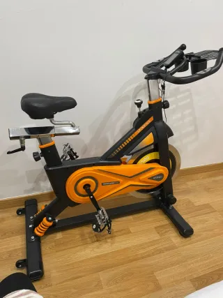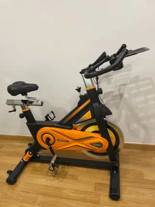 Bicicleta de spinning prácticamente nueva, solo montada y probada, sin uso real ya que finalmente no se necesitó. Cuenta con rueda de inercia de 18 kg, que proporciona un pedaleo suave, estable y silencioso. Ideal para entrenamientos en casa. Características principales: Rueda de inercia de 18 kg Transmisión por correa silenciosa Sillín y manillar regulables en altura y profundidad Estructura de acero robusta y estable Patas estabilizadoras Ruedas delanteras para fácil transporte Consola con información básica: tiempo, distancia, velocidad y RPM Estado impecable, como nueva
