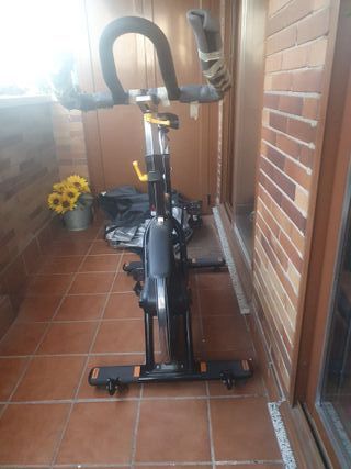 Bicicleta spinning Domyos en buen estado. Tiene velocímetro y contador de kilómetros . Volante de inercia de 15 kg Regalo el acolchado para el sillin. Ideal para hacer ejercicio en casa. Esta en muy buen estado. Habría que venir a recogerla. - Marca: Domyos - Perfecta para entrenamiento cardiovascular.