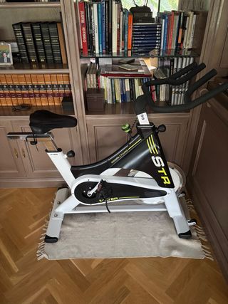 Bicicleta de spinning STR para entrenamiento en interiores. Diseño moderno y robusto. - Estructura blanca y negra. - Manillar ajustable. - Sillín cómodo.