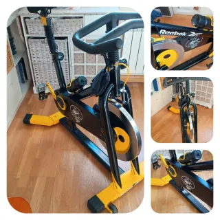 Bicicleta de spinning de la marca Reebok, con un diseño llamativo en negro y amarillo. - Estructura robusta. - Volante de inercia visible. - Pedales con agarre. - Manillar ajustable.