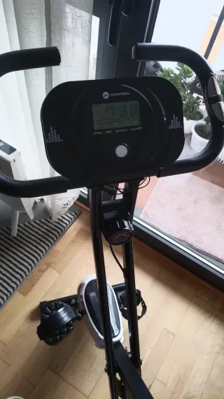 Bicicleta estática de la marca Domyos, ideal para entrenar en casa. - Asiento ajustable. - Pantalla digital que mide 4 diferentes medidas. Km/h Km Kcal Tiempo recorrido - No funcionan las velocidades.
