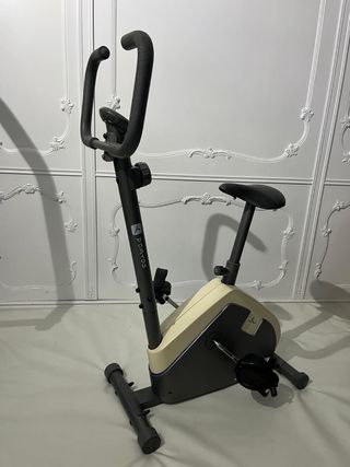 Bicicleta estática Domyos Essential Decathlon en perfecto estado, se ha usado muy poco. Con consola de 4 funciones (calorías, distancia, velocidad y tiempo), rueda de inercia y sillín ajustable. 24 kg. 87x48x121 cm. - Diseño compacto y moderno. - Asiento ajustable en altura. - Manillar ergonómico. Venta en mano.