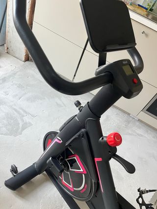 Bicicleta estática en buen estado, casi sin uso. - Diseño moderno y compacto. - Manillar ergonómico con agarres rojos. - Pantalla digital para seguimiento de ejercicio. - Sillín ajustable en altura.