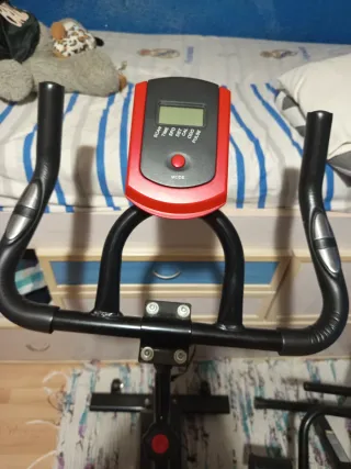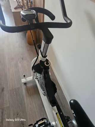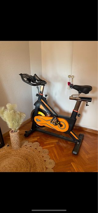 Bicicleta de spinning para entrenamientos en casa. Diseñada para ofrecer una experiencia de ciclismo interior. - Manillar ergonómico. - Sillín ajustable en altura y profundidad. - Pantalla digital para seguimiento de métricas. - Pedales con agarre. - Rueda de inercia para resistencia. En muy buen estado.