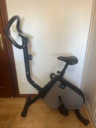 Bicicleta estática de la marca DOMYOS, modelo Essential 04. Diseñada para entrenamientos en casa. - Color negro y gris. - Manillar ergonómico. - Sillín ajustable. - Consola para medir frecuencia cardiaca, calorías, velocidad, tiempo..