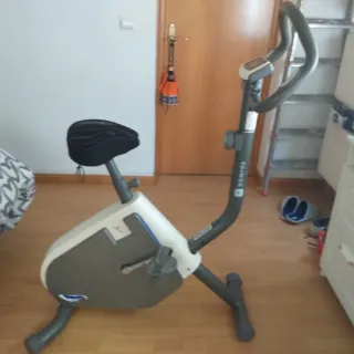 Bicicleta estática Domyos, ideal para entrenar en casa. Se pliega fácilmente para guardarla. - Diseño plegable. - Marca: Domyos. - Color: Beige y gris. Pantalla con calorías, distancia, tiempo y velocidad. Sillín y manillar ajustable. Está con tono amarillo por el paso del tiempo y el sillín con unas rajas superficiales. Pero funciona perfectamente.