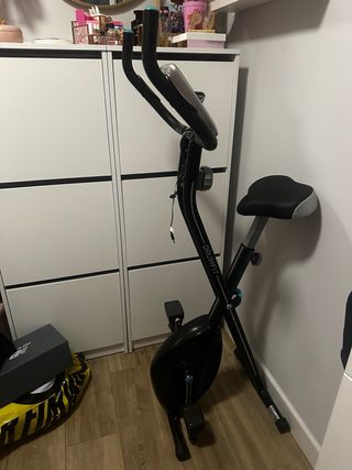 Bicicleta estática en color negro, ideal para entrenar en casa y recuper la forma fisica y perder esos kilitos de mas despues de las navidades. - Diseño compacto. - Soporte para botella integrado. - Pedales con agarre. - Diferentes programas de entrenamiento - Ajuste altura sillin. - Pantalla digital - Medicion de pulsaciones, registro de km, kcal quemadas... - Funcion perchero Una pequeña “mordida” en el sillin. Muy poco uso.