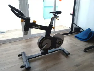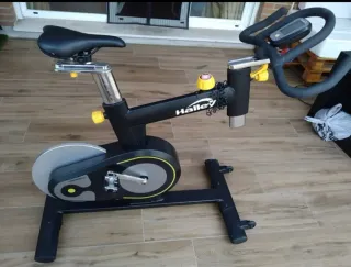 Bicicleta de spinning de la marca Halley, ideal para entrenamientos en casa. Muy equibrada gracias al volante de aluminio. NO NECESITA MANTENIMIENTO puesto que los frenos son magnéticos y la correa de transmisión Poly V. No lleva computador.