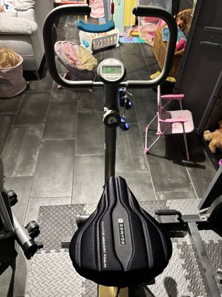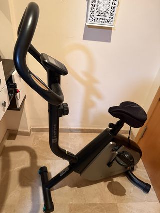Bicicleta estática Domyos modelo 120, ideal para entrenamientos en casa. Su diseño compacto la hace fácil de integrar en cualquier espacio. - Color negro. - Pantalla digital. - Soporte para botella. Si digo que se ha utilizado 30 minutos exagero, esta nueva. Se vende porque se utiliza mas de perchero que de bicicleta