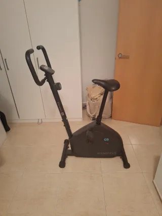 Bicicleta estática de la marca Essential+. - Diseño compacto y moderno. - Asiento ajustable. - Pedales con agarre.