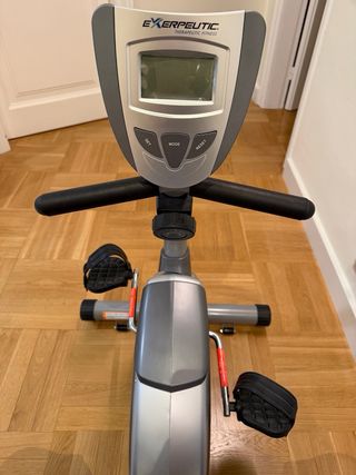 Bicicleta estática en buen estado, ideal para entrenar en casa. Su diseño plegable permite guardarla fácilmente. - Color principal: rojo y gris. - Asiento con respaldo ajustable. - Pantalla digital para seguimiento de ejercicio.