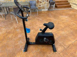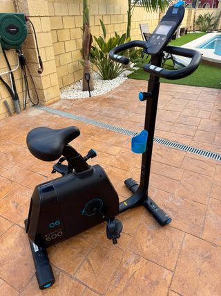 Bicicleta estática Domyos modelo 06 500. - Color negro. - Soporte para botella azul. - Pantalla digital.