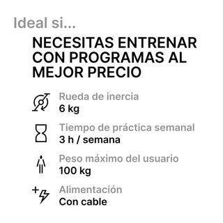 Bicicleta estática Domyos VM 190. Uso: Diseñada para el mantenimiento físico en casa, con un uso ocasional de hasta 30 minutos diarios. Fluidez de pedaleo: Cuenta con una rueda de inercia de 3,5 kg para una pedalada suave. Comodidad: El sillín es ajustable en altura. Funciones: La consola ofrece 4 funciones con autoscan: tiempo, distancia, calorías quemadas y velocidad. Compacta y fácil de mover: Su diseño compacto facilita su almacenamiento.