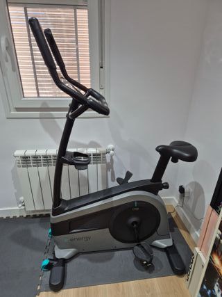 Bicicleta estática Domyos, modelo essential, ideal para entrenamientos en casa. Su diseño compacto la hace perfecta para cualquier espacio. La consola muestra 4 funciones: calorías quemadas, distancia recorrida, tiempo de entrenamiento y velocidad. El sistema de resistencia es manual de 8 niveles. Tiene una pequeña rajita en el sillín, porque pasé una silla de bebé de coche por encima y con uno de los enganches de abajo le hice la rajita sin querer, pero lo demás está todo perfecto, no ha tenido casi uso. Se vende en Aluche o Atocha, también envío.