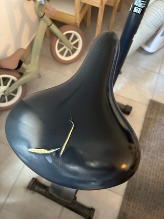 Bicicleta estática Domyos con el sillín rajado. - Sillín negro rajado por el tiempo. - Estructura metálica. - Poco uso.