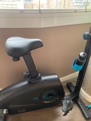 Bicicleta estática de la marca Domyos, modelo 900. - Color negro. - Soporte para botella integrado. - Pantalla digital con información de entrenamiento.