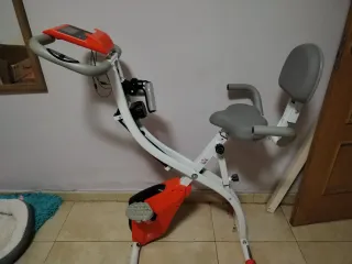 Bicicleta estática plegable, ideal para entrenar en casa. Su diseño compacto permite guardarla fácilmente. La vendemos por mudanza, solo tiene 2 años y 2 usos a recoger por la zona de Tetuán /francos Rodríguez No vale la pantalla, falta conectar los cables por todo lo demás está en perfecto estado - Color principal: blanco con detalles en naranja. - Asiento acolchado. - Pedales con correas de sujeción. - Manillar con agarres de goma.