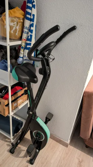 Bicicleta estática plegable, ideal para entrenar en casa. - Diseño compacto y fácil de guardar. - Pantalla digital para seguimiento de ejercicio. - Asiento ajustable en altura. - Pedales con agarre. Me la compré en la pandemia porque no podíamos salir de casa y necesitaba moverme, pero desde entonces no la he vuelto a usar. Está como nueva.