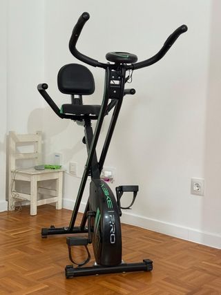 Bicicleta estática plegable Cecotec X-Bike Pro, ideal para entrenar en casa. - Diseño compacto y plegable. - Manillar ajustable. - Sillín ergonómico. - Pedales con correas de sujeción. Lo único que no funciona el led de abajo de los números de no usarla .