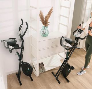 Bicicleta estática plegable Sportstech X100, ideal para entrenar en casa. Su diseño compacto permite guardarla fácilmente. Precio nueva 220€ - Estructura plegable. - Asiento con respaldo. - Manillar ajustable. - Bandas para ejercitar fuerza en los brazos