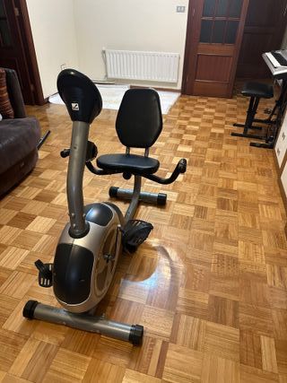 Bicicleta estática reclinada, ideal para entrenamientos en casa. Su diseño permite una postura cómoda durante el ejercicio. - Asiento acolchado. - Pedales con agarre. - Estructura metálica. Se puede regular en distancia a pedales y regulable intensidad del pedaleo. Funciona perfectamente. Se vende a ese precio porque falta una correa de agarre y un mango rajado. Se puede ver en dos ultimas fotos. Nada altera su funcionamiento. Lo rajado puede pegarse con un buen pegamento. Y la correa de agarre de puede hacer un apaño. Costó 300€.