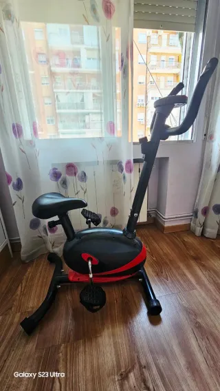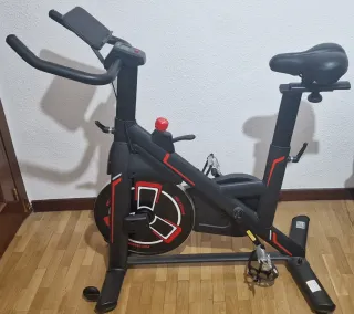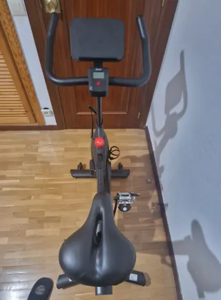 Bicicleta estática de diseño moderno en color negro con detalles en rojo. - Sistema de resistencia magnética. - Manillar ajustable. - Sillín cómodo y regulable. - Pedales con agarre. Muy poco uso, practicamente nueva