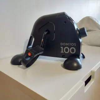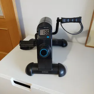 Mini bicicleta estática Domyos 100, ideal para ejercitar piernas y brazos. Muy poco usada porque la compré para rehabilitarme y cumplió tan bien su función, que prontísimo empecé a andar. - Pantalla digital con información de tiempo, vueltas, vueltas/min y calorías. - Resistencia ajustable mediante dial. - Pedales con correas para mayor sujeción. - Marca: Domyos.