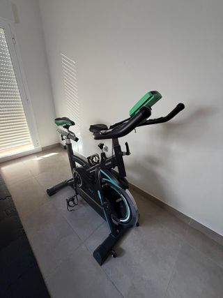 Bicicleta de spinning de la marca Drumfit, modelo Cecotec. - Diseño en color negro con detalles en turquesa. - Sillín acolchado. - Manillar ajustable. la vendo por tener dos iguales y solo uso una, acepto cambio por material de gym