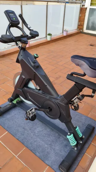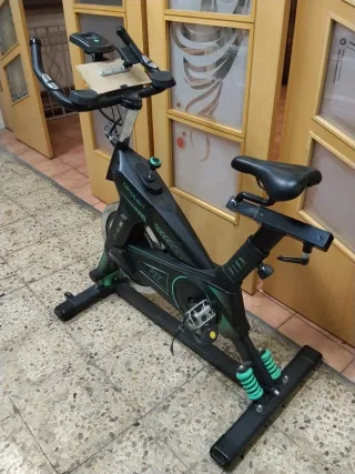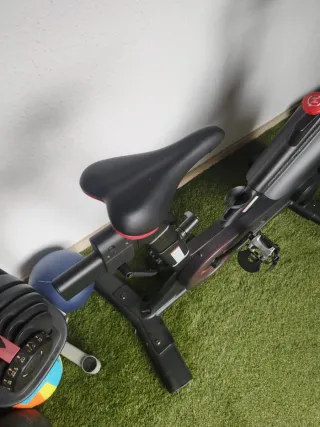 Bicicleta de spinning en color negro, ideal para entrenamientos en casa. Está completamente nueva, no la he usado. La devuelvo porque se me queda un poco pequeña (mido 1.90). - Diseño robusto y estable. - Asiento ajustable en altura y posición. - Manillar ergonómico y ajustable. - Pedales con agarre. - Resistencia ajustable. - Dispone de NFC para conectar el móvil y apps de entrenamiento