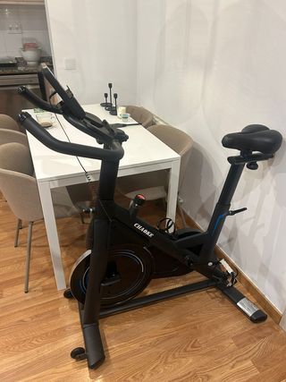 Bicicleta estática Domyos en buen estado, ideal para entrenamientos en casa. - Diseño compacto y funcional. - con ruedas para fácil traslado - Pantalla digital para seguimiento de datos. - Sillín ajustable. - Pedales con agarre. -soporte botellín