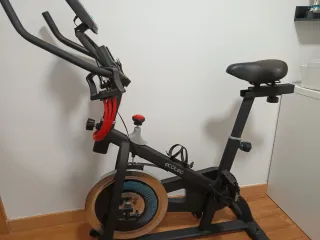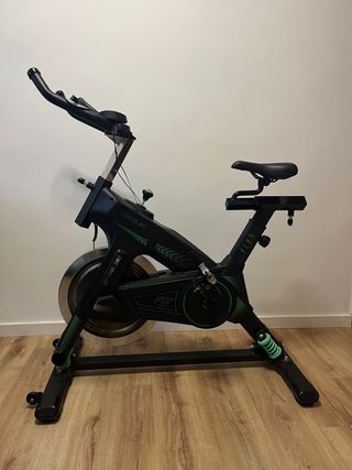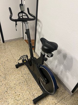 Bicicleta estática tipo spinning en muy buen estado de funcionamiento. Se vende por falta de uso, prácticamente no se ha utilizado. A nivel estético puede verse algo usada porque ha estado varios años en el balcón, pero son solo detalles superficiales (polvo y marcas leves), nada que afecte a su rendimiento. Es una bici robusta y estable, ideal para entrenar en casa. Cuenta con volante de inercia para un pedaleo suave, resistencia regulable, sillín ajustable y pantalla para controlar tiempo, distancia y calorías. Funciona perfectamente, lista para usar. Precio: 150€ (negociable) Ubicación: Barcelona Solo gente interesada