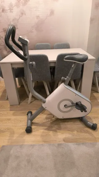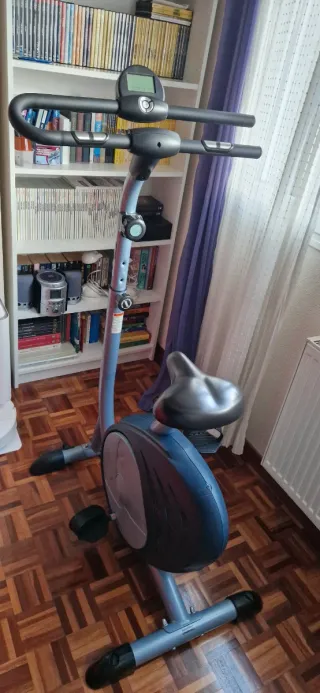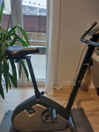 Bicicleta estática de la marca Domyos, comprada en Decathlon. Ideal para entrenamientos en casa. - Diseño compacto y moderno. - Soporte para móvil o tablet. - Portabidón integrado.