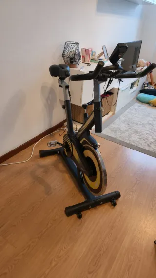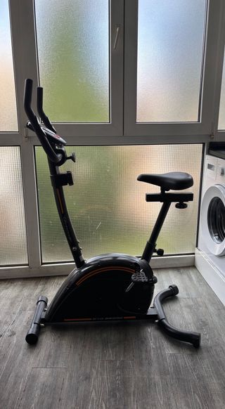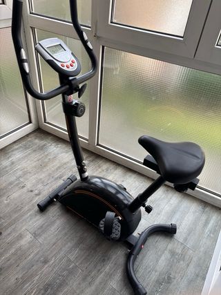 Vendo bicicleta estática Domyos Essential 2 de Decathlon, perfecta para hacer cardio en casa sin ocupar mucho espacio. Tiene unos seis años, pero funciona correctamente y la uso muy poco, así que la transmisión y la resistencia siguen yendo suaves. Dispone de consola con funciones básicas (tiempo, distancia, velocidad, calorías y pulso), resistencia manual regulable en 8 niveles y sillín ajustable en altura. Como defecto estético, la espuma del manillar está algo dañada por las uñas de los gatos (se ve en las fotos), pero no afecta al uso. A recoger en Bolueta (Bilbao).