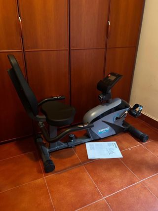 Bicicleta estática reclinada con sistema de resistencia magnética de 7 kg. Diseñada para un entrenamiento cómodo y efectivo en casa. Comprada por 211€ - Asiento ergonómico con respaldo. - Pedales con agarre. - Pantalla para seguimiento de datos.