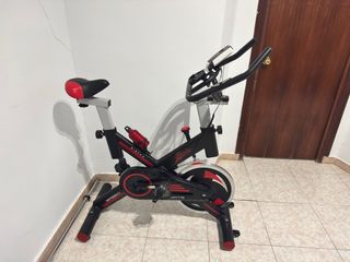 Bicicleta de spinning de la marca Riscko Sport, en excelente estado. - Diseño deportivo en negro y rojo. - Incluye portabidón. - Incluye soporte para el movil.