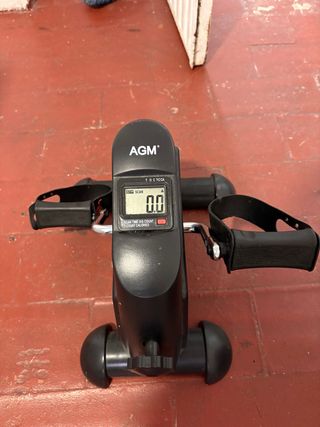 Mini bicicleta estática de la marca AGM, ideal para ejercitar piernas y brazos. - Pantalla digital con funciones de tiempo, distancia, conteo y calorías. - Pedales con correas ajustables. - Diseño compacto y portátil.
