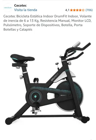 Bicicleta estática Cecotec modelo DrumFit Indoor. Ideal para entrenamientos en casa. - Volante de inercia de 6 a 13 Kg. - Resistencia manual. - Monitor LCD. - Pulsómetro. - Soporte para dispositivos. - Portabotellas. Totalmente nueva. No se ha usado. Conservo la caja original
