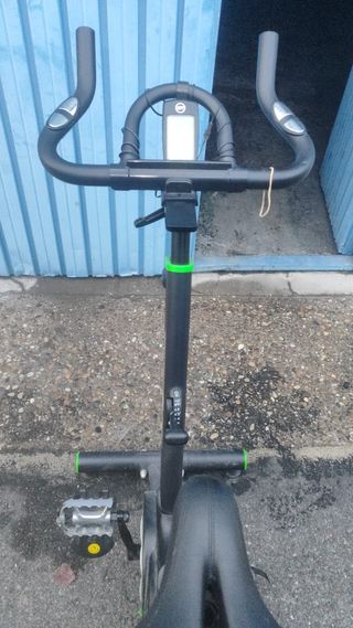 Bicicleta de spinning como nueva usadas muy pocas veces. Volante de inercia de 24 kg Resistencia con intensidad regulable Ruedas para su fácil trasporte Freno de emergencia Pantalla LCD con: -Tiempo de uso -Velocidad -Odometro total -Odometro parcial -Calorias consumidas -Pulsometro Sillin anatómico regulable (Vertical y horizontal) Manillar regulable en altura. Porta bidón Calas Para un usuario entre 1'55cm y 1'90cm Peso Max 110 Precio negociable