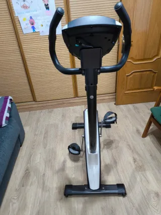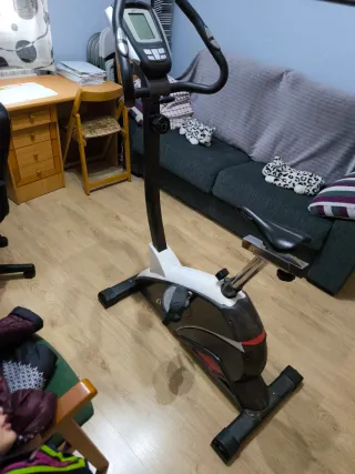 Bicicleta estática para hacer ejercicio en casa. Está en buen estado, aunque tiene algunas señales de uso. - Monitor digital que muestra velocidad, calorías, tiempo y distancia. - Funciones de auto y manual. - Zonas de entrenamiento de frecuencia cardíaca. - Asiento cómodo y ajustable.