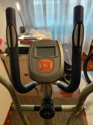Bicicleta elíptica para ejercicio en casa. Cuenta con un diseño moderno y funcional. Muy poco uso. - Pantalla digital con información de entrenamiento. - Mandos ergonómicos en los manillares. - Control de resistencia ajustable.