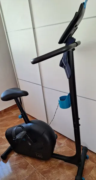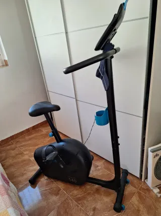 Bicicleta estática de Decathlon, modelo 140. Perfecta para entrenar en casa. - Diseño compacto. - Sillín ajustable. - Manillar ergonómico. -Incluye protector de sillín para evitar el dolor.