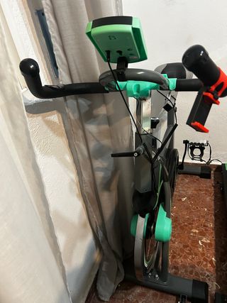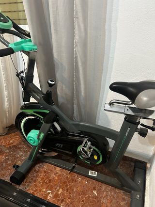 Bicicleta estática Cecotec FIT en color negro con detalles en verde menta. Ideal para entrenamientos en casa. El unico desperfecto que tiene es ese del sillin que se ve. - Manillar ajustable. - Sillín ergonómico. - Pantalla digital. - Rueda de inercia.
