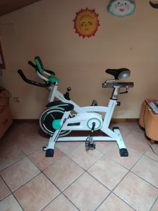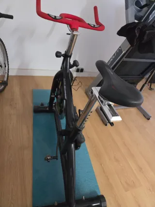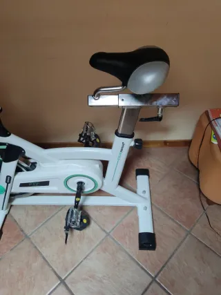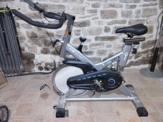 Bicicleta de spinning con transmisión por correa silenciosa y pantalla multifunción (tiempo, velocidad, pulsaciones...). - Diseño robusto. - Asiento acolchado ajustable. - Manillar ajustable. - Resistencia regulable. - Pedales con agarre y calapiés. - Ruedas para fácil transporte. - Muy poco uso, perfecto estado de funcionamiento. - Precio negociable.