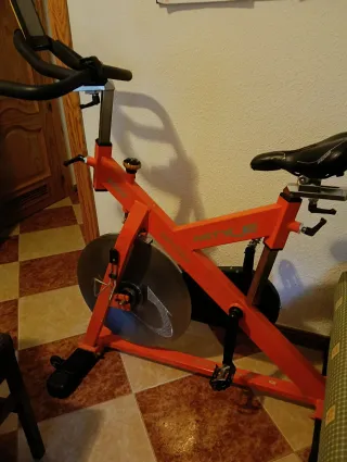 Bicicleta spinning en buen estado, ideal para hacer ejercicio en casa. - Estructura robusta y resistente. - Color naranja y negro. - Perfecta para principiantes y usuarios intermedios.