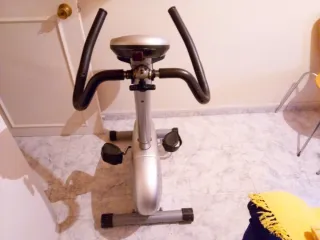 Bicicleta estática plateada, ideal para hacer ejercicio en casa. Se regula, ( fácil ) manillar y sillin ( tiene un embellecedor de plástico que cubre la barra del sillín ). Tablero digital ( lleva 2 Pilas pequeñas ) . Pedales con cubre pie , para que no se te salgan los pies . Con 8 diferentes niveles de velocidad y resistencia. En él manillar tiene un dispositivo para marcar las pulsaciones . Se compró en él Corte Inglés, precio 649 euros . Nueva , la dejo de segunda mano , por 90 euros.