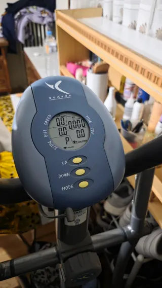 Bicicleta estática de la marca Domyos, ideal para entrenamientos en casa. Cuenta con un monitor digital para seguir tu progreso. - Monitor con pantalla LCD. - Funciones: Distancia, Velocidad, Tiempo, Calorías y Pulso. - Botones de control: UP, DOWN, MODE.
